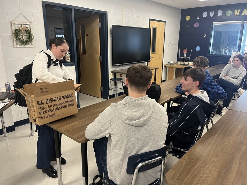 Students in Becky Sphar’s Foods On Your Own class select which MRE they want to use during a recent cooking challenge.