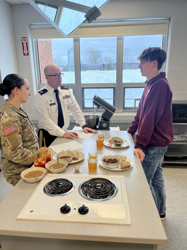 The yellow team of Anna Boving, Ryley Donohue, Mason Seipel and Jisaiah Wheeler chose the chicken, egg noodles and vegetables in sauce MRE. This group made a chicken noodle soup flavored with garlic and onion powder. To accompany the soup, they mixed flour, milk, egg, salt and cinnamon to create a thin pancake, which they filled with a fruit jam filling.
