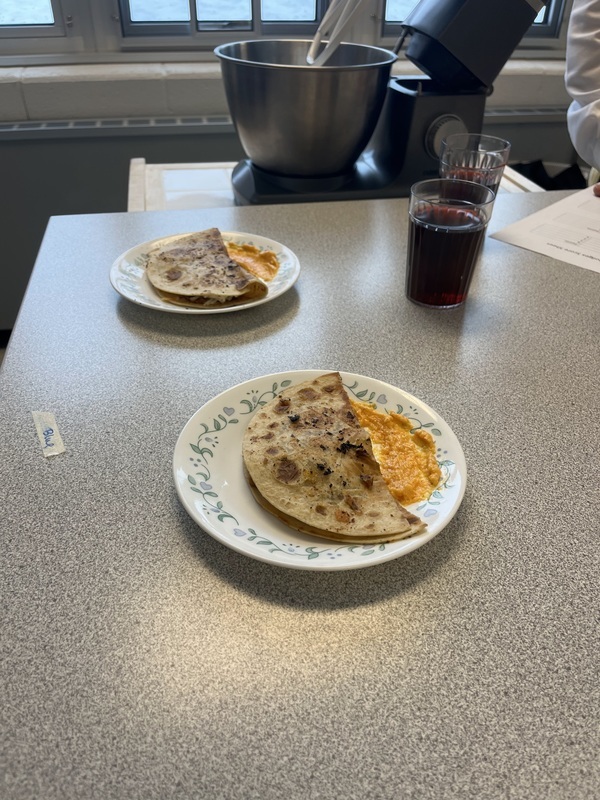The blue team’s finished dish, a barbeque chicken quesadilla with a crunchy corn crumble.