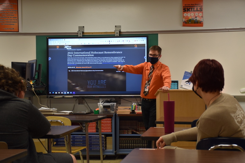Mr. Luke Simon introduces a video from the United States Holocaust Memorial Museum Thursday afternoon during his and Mrs. Jody Brydalski’s joint Holocaust elective.