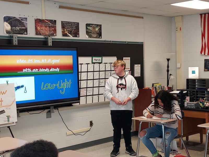 Students worked in groups of two to four to come up with an invention or innovation that could solve a problem, explained Hruby. Once students agreed on an idea, they drew it, wrote an advertising slogan for the product using poetic elements, designed a company logo using color symbolism and then created a slideshow presentation to pitch to potential investors.